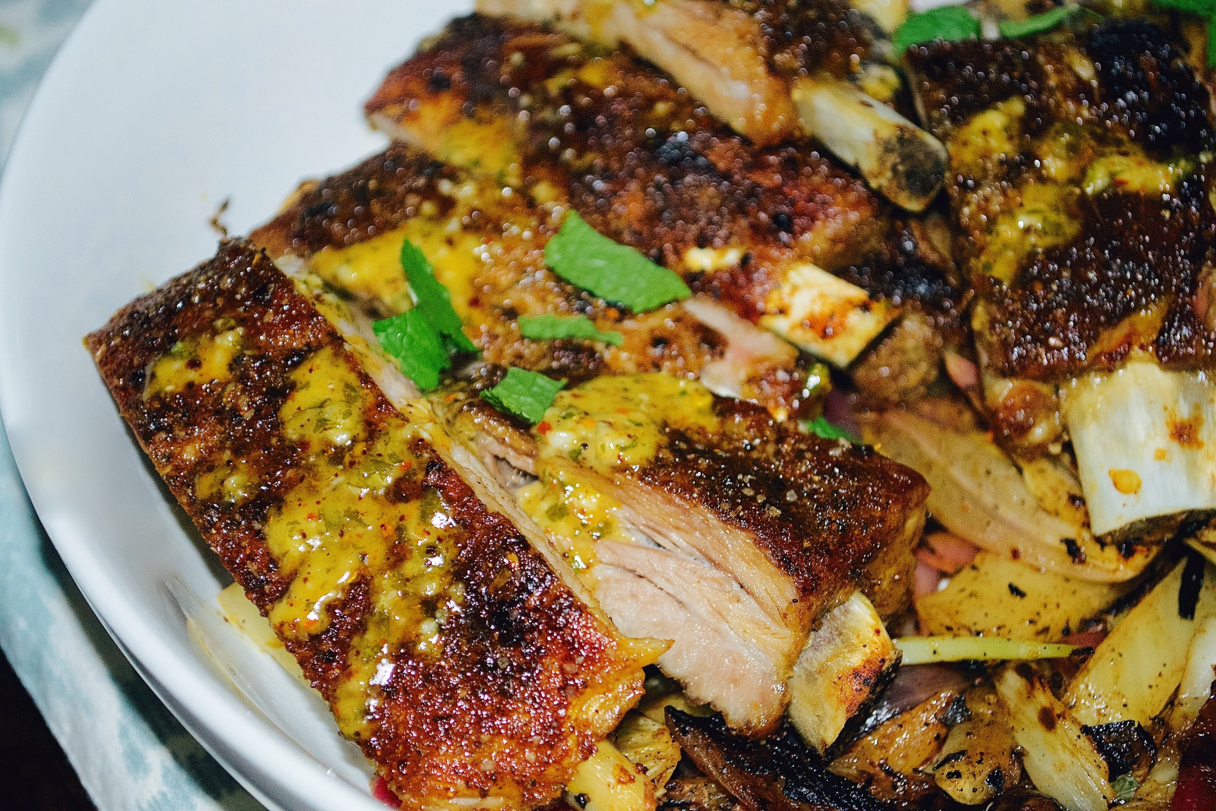 slow-roasted harissa-spiced pork ribs served over grilled fennel and red onions